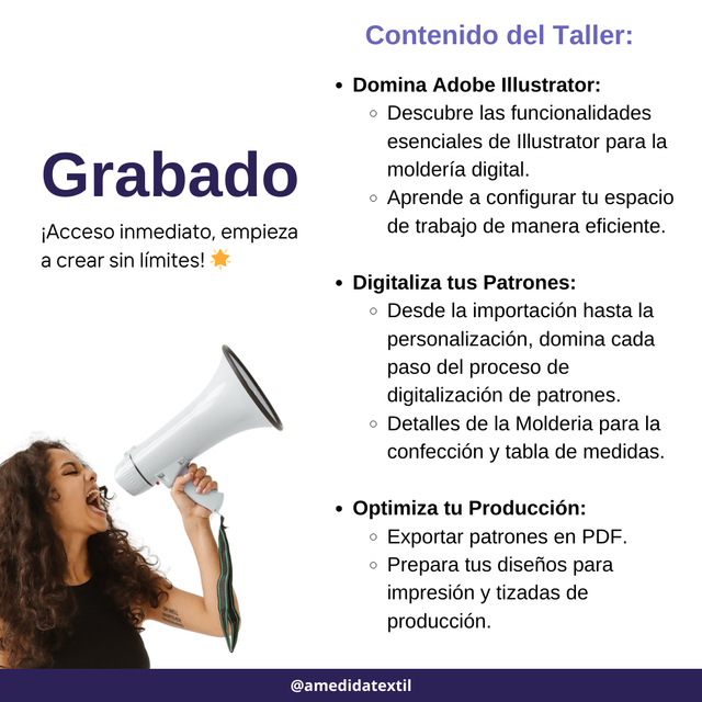 QUÉ INCLUYE LA COMPRA ✓ 4 horas de video grabado (acceso permanente) ✓ Grabación completa del taller en vivo ✓ Material descargable para practicar ✓ Moldes de ejemplo listos para digitalizar ✓ Acceso a comunidad WhatsApp A MEDIDA TEXTIL ✓ Certificado de finalización de curso. ✓ Soporte y consultas con la comunidad.