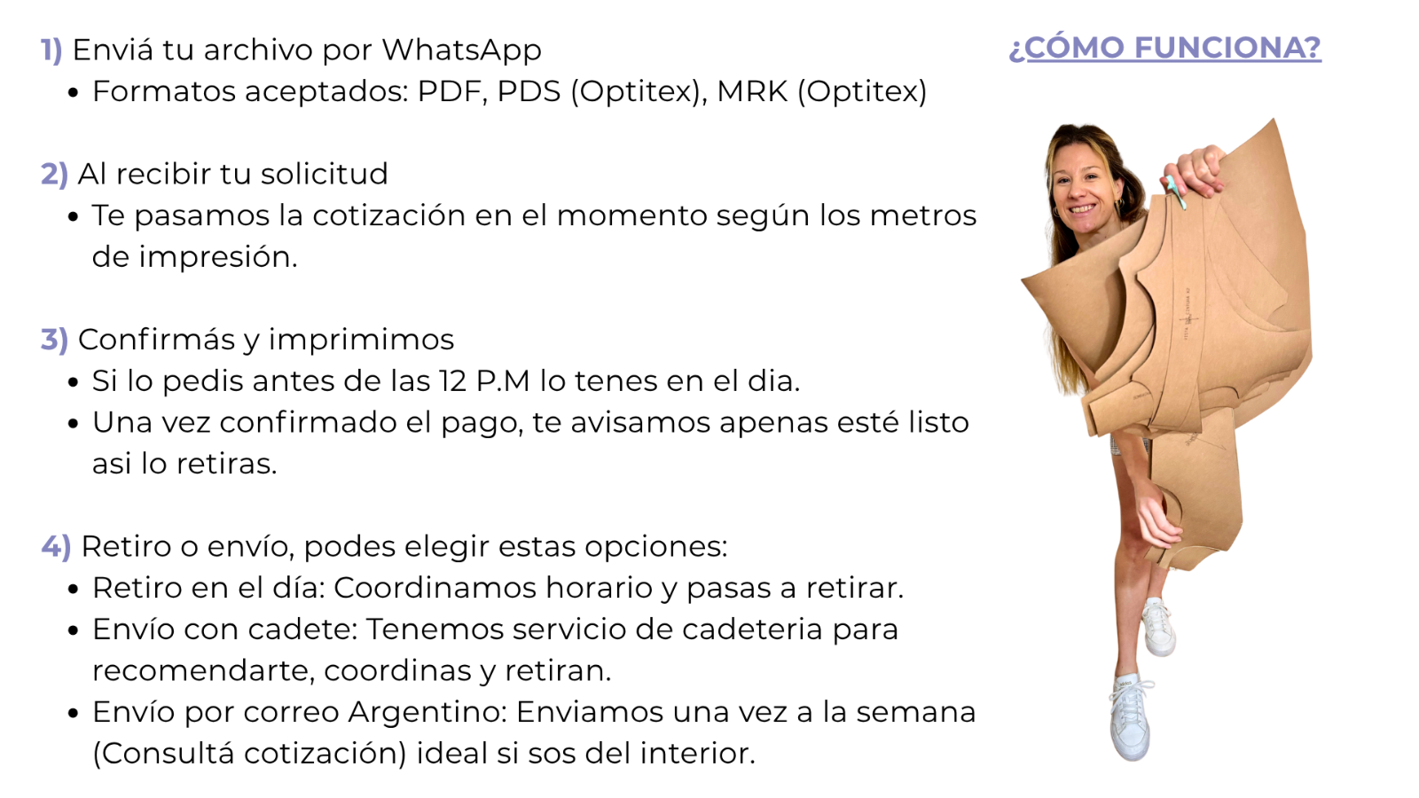 1. OBJETO Las presentes bases y condiciones regulan la compra y uso de moldes digitales, moldes físicos impresos, servicios de impresión y moldes a pedido ofrecidos por A MEDIDA (en adelante, "el Vendedor"). Al realizar una compra, el cliente acepta de forma expresa estas condiciones. 2. PRODUCTOS Y SERVICIOS 2.1 Moldes Digitales Archivos digitales en formato PDF y/o RAR Escala tamaño real para impresión en plotter Incluyen líneas de corte, piquetes y dirección de hilo NO incluyen instrucciones de confección ni armado 2.2 Moldes Físicos Impresos Venta por talle individual Opciones: Papel 57gr o Cartón 140gr Se entregan enrollados y empaquetados Optimizados para reducir desperdicios 2.3 Servicio de Impresión Impresión en plotter en el día Cotización previa según metraje Formatos aceptados: PDF, PDS, MRK 2.4 Moldes a Pedido Desarrollo personalizado según especificaciones del cliente Requiere aprobación de presupuesto previo Tiempo de entrega según complejidad 3. PROCESO DE COMPRA Y PAGO 3.1 Forma de Pago Transferencia bancaria a cuenta de Banco Galicia Titular: Eliana Luna Alias: LIBRE.AFRICA.URNA 3.2 Confirmación El cliente debe enviar comprobante de pago por WhatsApp Incluir: nombre completo, email y producto adquirido La compra se considera confirmada al recibir el pago 4. ENTREGA 4.1 Moldes Digitales Entrega: Enlace de descarga vía email Plazo: Máximo 24 horas hábiles tras confirmación de pago El enlace estará disponible por tiempo indefinido El cliente es responsable de guardar y respaldar sus archivos 4.2 Moldes Físicos Envío por correo o cadete (coordinación por WhatsApp) Los tiempos dependen del servicio de correo elegido El vendedor no se responsabiliza por demoras del correo 4.3 Servicio de Impresión Impresión en el día Retiro o envío a coordinar con el cliente 5. USO DE LOS MOLDES 5.1 Licencia de Uso Los moldes son para uso personal/comercial del taller o marca del cliente Se permite su uso para confección y producción propia NO se permite:Reventa de los archivos digitales Distribución gratuita o paga de los archivos Compartir en redes sociales o plataformas digitales Publicación en sitios web de terceros 5.2 Derechos de Autor Todos los moldes son propiedad intelectual de A MEDIDA El cliente adquiere una licencia de uso, NO la propiedad del diseño 6. RESPONSABILIDADES 6.1 Del Vendedor Entregar moldes con las especificaciones técnicas correctas Proporcionar moldes con escalas de talles apropiadas Garantizar la calidad de impresión (en moldes físicos) 6.2 Del Cliente REALIZAR SIEMPRE UNA MUESTRA antes de producción en escala Verificar compatibilidad de telas y materiales Ajustar según necesidades específicas de su producción Tener conocimientos de confección y patronaje 6.3 Limitación de Responsabilidad El vendedor NO se responsabiliza por: Resultados finales de las prendas confeccionadas Elección inadecuada de telas o materiales Errores en el proceso de confección del cliente Falta de conocimientos técnicos del cliente Variaciones en el calce por tipo de tela utilizada Producciones realizadas sin muestra previa Pérdidas económicas derivadas del uso de los moldes 7. POLÍTICA DE DEVOLUCIONES 7.1 Moldes Digitales NO se aceptan devoluciones por tratarse de productos digitales Una vez enviado el enlace de descarga, la venta es definitiva No hay reembolsos por: cambio de opinión, error en la compra, desconocimiento del producto 7.2 Moldes Físicos Se aceptan reclamos SOLO si: El producto llegó dañado (con foto del empaque y molde) Falta de piezas del molde Error en el talle enviado Plazo para reclamos: 48 horas desde recepción El cliente debe conservar el empaque original 7.3 Exclusiones NO se aceptan devoluciones por: El molde "no me quedó bien" (se recomienda hacer muestra) "No es lo que esperaba" Errores de confección del cliente Elección incorrecta de tela Desconocimiento de técnicas de confección 8. GARANTÍAS Y CALIDAD 8.1 Garantía de Calidad Moldes probados y aprobados técnicamente Escalas de talles reales y proporcionadas Líneas de corte, piquetes e hilos correctamente marcados 8.2 Lo que NO se garantiza Calce perfecto sin realizar ajustes Resultados idénticos a fotos de referencia Compatibilidad con todo tipo de telas Que el molde "quede bien" sin muestra previa 8.3 Recomendación Obligatoria SIEMPRE hacer una muestra antes de producción en escala para: Verificar calce y ajuste Comprobar compatibilidad con la tela elegida Realizar ajustes necesarios según necesidad 9. RECLAMOS 9.1 Procedimiento Enviar reclamo por WhatsApp dentro de las 48hs Incluir: número de pedido, descripción del problema, fotos Esperar respuesta del equipo (24-48hs hábiles) 9.2 Soluciones Posibles Según el caso, se puede ofrecer: Reenvío de archivo digital Reimpresión de molde físico Corrección de errores técnicos comprobables NO se ofrecen reembolsos 10. CONFIDENCIALIDAD Los datos del cliente se usan exclusivamente para la transacción No se comparten con terceros Se conservan para registro de ventas 11. MODIFICACIONES A MEDIDA se reserva el derecho de modificar estas bases y condiciones en cualquier momento. Las modificaciones serán notificadas en el sitio web y aplicarán a compras futuras. 12. CONTACTO Para consultas, reclamos o soporte: WhatsApp: +5491157016792 Email: hola@amedidatextil.com Horario de atención: 10 a 17 hs Lunes a Viernes 13. ACEPTACIÓN Al realizar la compra, el cliente declara: Haber leído y comprendido estas bases y condiciones. Aceptar todos los términos establecidos. Tener conocimientos de confección necesarios. Comprometerse a realizar muestra antes de producción.