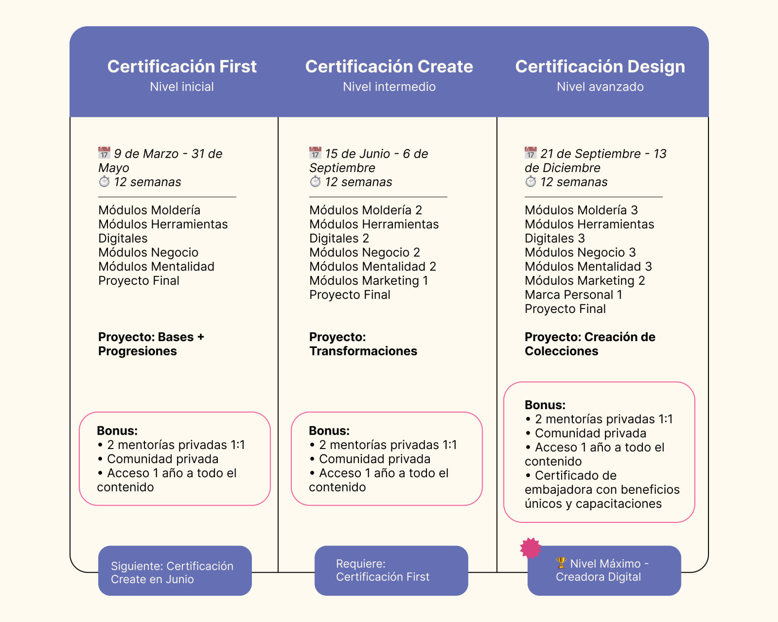 Si elegiste comenzar solo por la certificación inicial vas a poder continuar aprendiendo inscribiéndote en los niveles Intermedio y Avanzado. Y si completas el 100% de entregas, podés acceder al programa de Embajadora.